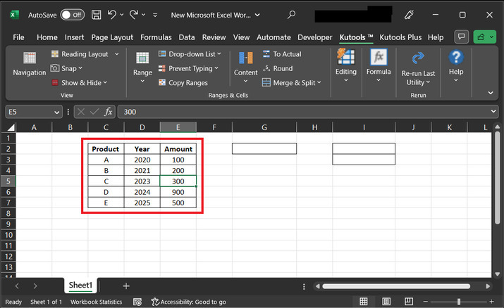 在本例中,使用者將瞭解使用 Kutools 生成最大值和最小值的過程。Excel 表格的截圖如下: