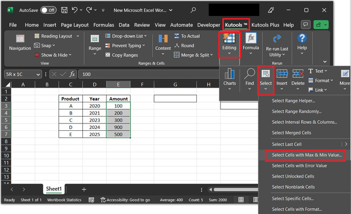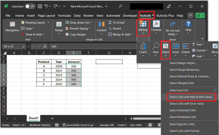 開啟Kutools 選項卡,然後轉到“編輯”部分,選擇“選擇”選項。在“選擇”選項卡下,選擇“選擇具有最大值和最小值的單元格...”選項。請參考下圖瞭解資料處理效率。
