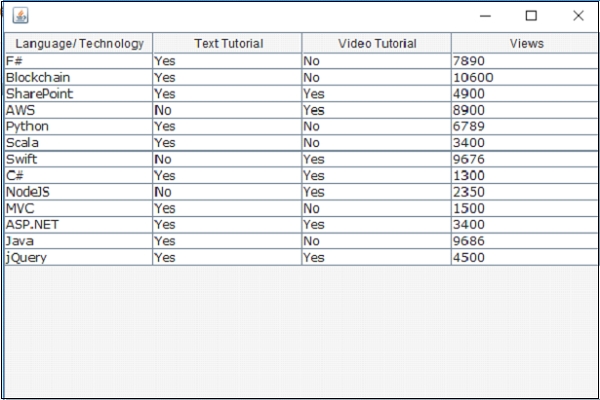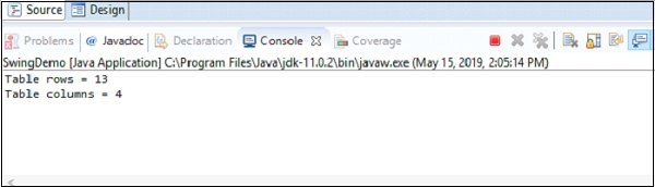 以下是一個用於獲取 JTable 行數和列數的示例 −