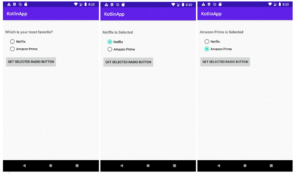 此示例演示瞭如何在Android中使用Kotlin獲取RadioGroup的選擇索引。