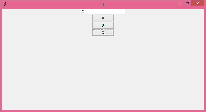 # Import the required libraries from tkinter import * from tkinter import ttk # Create an instance of tkinter frame or window win=Tk() # Set the size of the window win.geometry("700x350") def on_click(text): entry.delete(0, END) entry.insert(0,text) # Add an Entry widget entry=Entry(win, width= 25) entry.pack() # Add Buttons in the window b1=ttk.Button(win, text= "A", command=lambda:on_click("A")) b1.pack() b2=ttk.Button(win, text= "B", command=lambda: on_click("B")) b2.pack() b3=ttk.Button(win, text= "C", command=lambda: on_click("C")) b3.pack() win.mainloop()