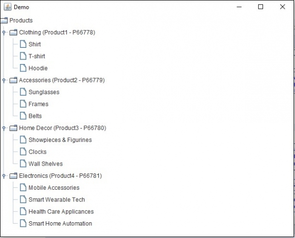 DefaultMutableTreeNode node4 = new DefaultMutableTreeNode("Electronics (Product4 - P66781)");