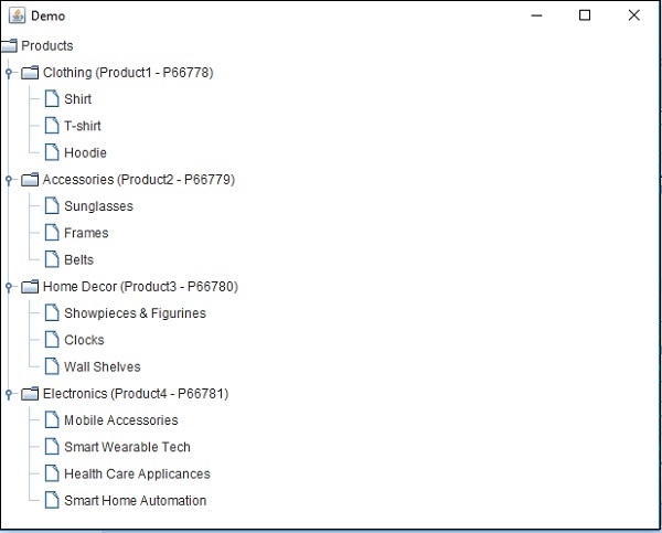 DefaultMutableTreeNode node4 = new DefaultMutableTreeNode("Electronics (Product4 - P66781)");