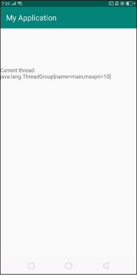 package com.example.myapplication; import android.os.Bundle; import android.support.v7.app.AppCompatActivity; import android.widget.TextView; public class MainActivity extends AppCompatActivity { TextView textView; @Override protected void onCreate(Bundle savedInstanceState) { super.onCreate(savedInstanceState); setContentView(R.layout.activity_main); textView = findViewById(R.id.text); textView.setText("Current thread: " + Thread.currentThread().getThreadGroup()); } }