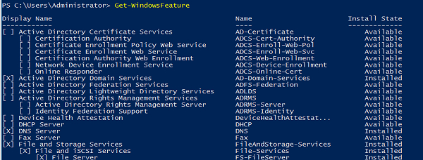 從 Windows Server 2008 開始,在伺服器作業系統上使用 PowerShell 執行 **Get-WindowsFeature** 時,您將獲得如下輸出。