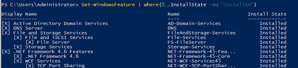 Get-WindowsFeature | where{$_.InstallState -eq "Installed"}輸出