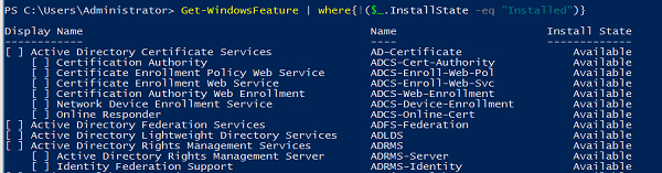 Get-WindowsFeature | where{!($_.InstallState -eq "Installed")}輸出