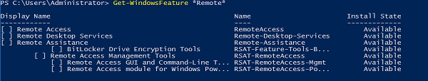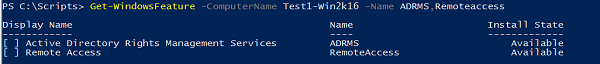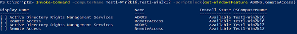 Get-WindowsFeature -ComputerName Test1-Win2k16 -Name ADRMS,Remoteaccess