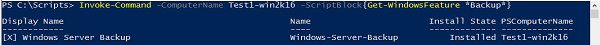 Invoke-Command -ComputerName Test1-win2k16 -ScriptBlock{Get-WindowsFeature *Backup*}![]()