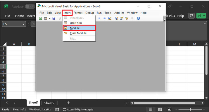 以上步驟將開啟一個“Microsoft Visual Basic for Applications”對話方塊。在出現的對話方塊中,單擊“插入”選項卡,然後選擇“模組”選項。