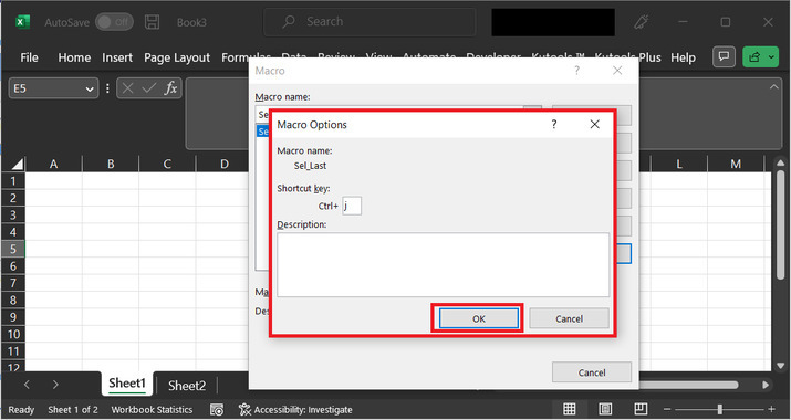 這將開啟一個宏選項對話方塊。在快捷鍵輸入框中,輸入“J”。最後單擊“確定”按鈕。