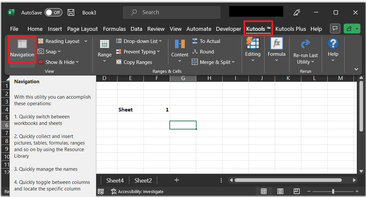 對於此示例,讓我們考慮同一個Excel電子表格。在這個表中,使用者只需輸入工作表編號。在Excel工作表中,單擊“Kutools”選項,然後在“檢視”部分下,單擊“導航”按鈕。