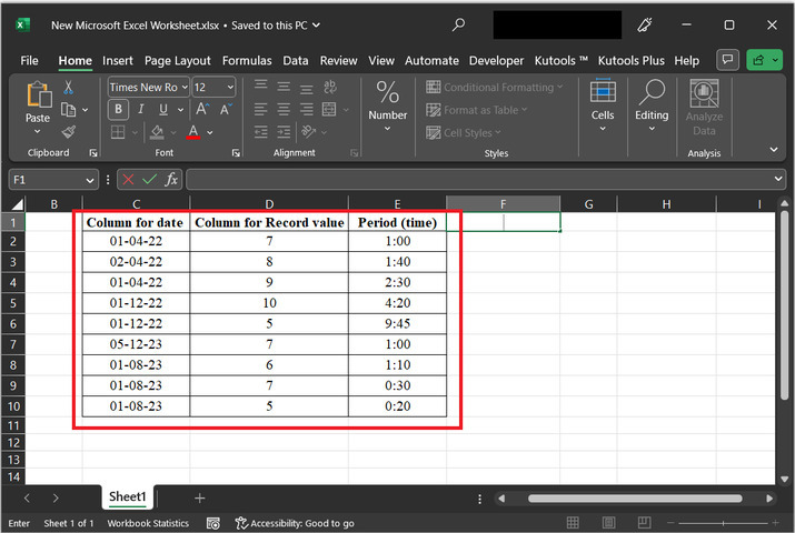 為了理解按半小時或 15 分鐘對資料進行分組的過程,使用者首先需要考慮以下提供的 Excel 表格。此 Excel 表格包含三列。第一列包含日期欄位,第二列包含記錄欄位,第三列包含時段的資料欄位。使用者可以根據需要更改單元格格式和語法。