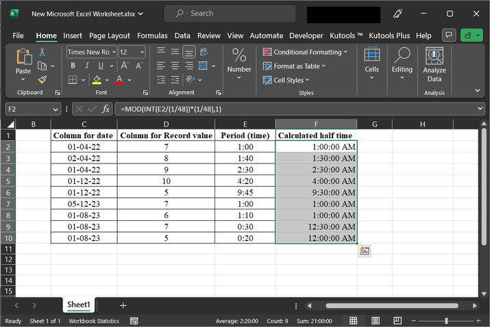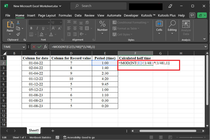 此步驟將首先建立一個輔助列。為此,首先轉到 F2 單元格,然後為值建立列標題。只需在 F1 單元格中寫入“計算的半小時”。然後轉到 F2 單元格,並鍵入公式“=MOD(INT(E2/(1/48))*(1/48),1)”. 正確的操作方法如下所述: