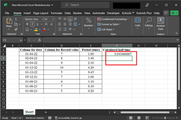 將 F2 單元格拖動到 F10 單元格,此步驟將複製相同的公式到不同的單元格值。現在,觀察 F 列的值,資料以時間格式顯示。現在,使用者需要建立一個單獨的資料透視表來解決提供的任務。
