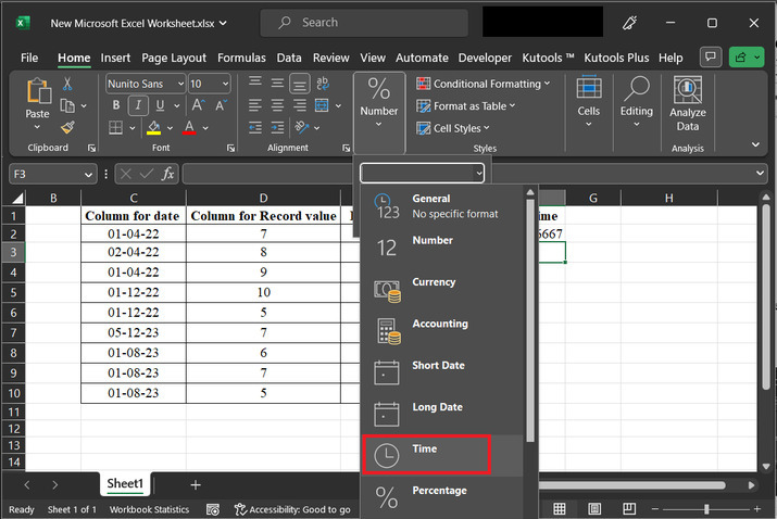 將獲得的結果拖動到 10 行,此步驟將複製 F2 到 F10 行的公式。在顯示值以常規資料型別顯示後,使用者需要將列值轉換為時間資料型別。為此,請單擊以下提供的箭頭。這將顯示選項列表,例如數字、貨幣等等。從提供的選項列表中,選擇值為“時間”的選項。請考慮以下給出的影像快照以供參考。
