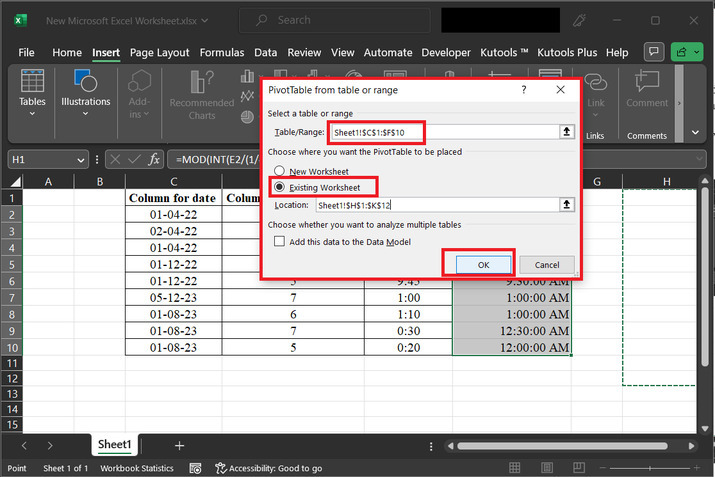 上述步驟將顯示一個“來自表格或區域的資料透視表”對話方塊,如下所示。在出現的對話方塊中,在標籤“表格/區域”下選擇表格資料值,並選擇“現有工作表”選項。在“位置”選項中,使用者需要提供使用者希望放置資料透視表的位置。然後單擊“確定”按鈕。
