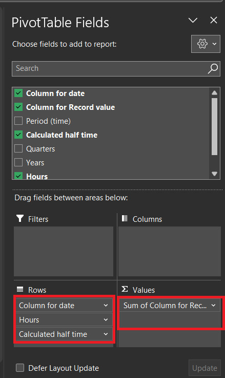上述步驟將顯示“資料透視表字段”對話方塊。在“行”部分,拖動日期和半小時的資料值。在“值”單元格列中,拖動記錄總和的欄位資料值。