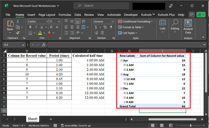 完成所有提供的步驟後,使用者將能夠從 Excel 中提供的普通表格生成資料透視表,並且還能夠使用資料透視表將資料分組為半小時或 15 分鐘。此示例描述了一種解決所需任務的簡單方法。