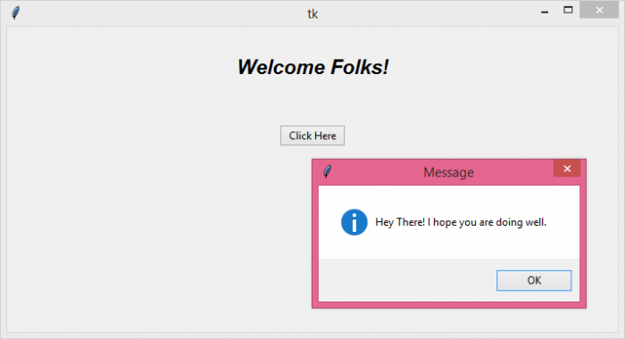 # Import the required libraries from tkinter import * from tkinter import messagebox from tkinter import ttk # Create an instance of tkinter frame win= Tk() # Set the size of the tkinter window win.geometry("700x350") # Define a function to show the popup message def show_msg(): messagebox.showinfo("Message","Hey There! I hope you are doing well.") # Add an optional Label widget Label(win, text= "Welcome Folks!", font= ('Aerial 17 bold italic')).pack(pady= 30) # Create a Button to display the message ttk.Button(win, text= "Click Here", command=show_msg).pack(pady= 20) win.mainloop()