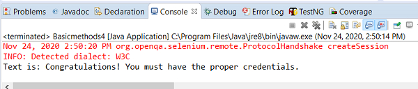 https://username:password@URL https://admin:admin@the−nternet.herokuapp.com/basic_auth Here, the admin is the username and password. URL − www.the-internet.herokuapp.com/basic_auth