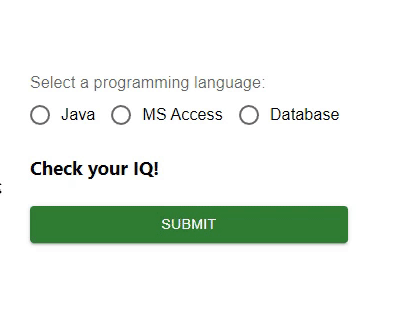 import { Button, Radio, RadioGroup } from "@mui/material"; import * as React from "react"; import FormControlLabel from "@mui/material/FormControlLabel"; import FormControl from "@mui/material/FormControl"; import FormLabel from "@mui/material/FormLabel"; import { useState } from "react"; const App = () => { const [val, setVal] = useState(''); const [error, setError] = useState(false); const [option, setOption] = useState('Check your IQ!'); const handleRadioChange = (e) => { setVal(e.target.value); setOption(' '); setError(false); }; const hdlRadio = (e) => { e.preventDefault(); if (val === 'Java') { setOption('You are correct!'); setError(false); } else if (val === 'MS Access') { setOption('Sorry, incorrect answer!'); setError(true); } else if (val === 'Database') { setOption('Sorry, incorrect answer!'); setError(true); } else { setOption('Choose any option.'); setError(true); } }; return ( <div> <form onSubmit={hdlRadio}> <FormControl sx={{p: 10}}> <FormLabel>Select a programming language:</FormLabel> <RadioGroup value={val} onChange={handleRadioChange} row aria-labelledby="label-pl" name="rg-pl"> <FormControlLabel value="Java" control={<Radio color="info" />} label="Java" /> <FormControlLabel value="MS Access" control={<Radio color="success" />} label="MS Access" /> <FormControlLabel value="Database" control={<Radio color="warning" />} label="Database" /> </RadioGroup> <h3>{option}</h3> <Button sx={{ mt: 1, mr: 1 }} type="submit" color="success" variant="contained"> Submit </Button> </FormControl> </form> </div> ); }; export default App;
