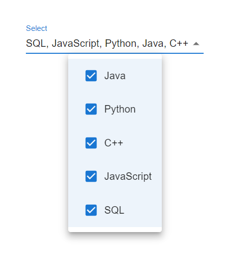 import React from "react"; import { useState } from "react"; import InputLabel from "@mui/material/InputLabel"; import MenuItem from "@mui/material/MenuItem"; import { Box, Checkbox, ListItemText } from "@mui/material"; import FormControl from "@mui/material/FormControl"; import Select from "@mui/material/Select"; const language = ["Java", "Python", "C++", "JavaScript", "SQL"]; const App = () => { const [state, setState] = useState([]); const handleMultiple = (e) => { const { target: { value }, } = e; setState( typeof value === "string" ? value.split(",") : value ); }; return ( <div> <Box sx={{ p: 10 }}> <FormControl variant="standard" size="large" sx={{ m: 1, minWidth: 120 }}> <InputLabel id="select" label="Lang"> Select </InputLabel> <Select multiple value={state} onChange={handleMultiple} renderValue={(selected) => selected.join(', ')}> {language.map((lang) => ( <MenuItem key={lang} value={lang}> <Checkbox checked={language.indexOf(lang) > -1} /> <ListItemText primary={lang} /> </MenuItem> ))} </Select> </FormControl> </Box> </div> ); }; export default App;
