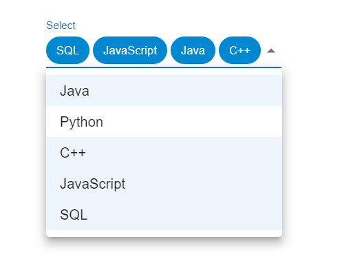 import React from "react"; import { useState } from "react"; import InputLabel from "@mui/material/InputLabel"; import MenuItem from "@mui/material/MenuItem"; import { Box, Chip } from "@mui/material"; import FormControl from "@mui/material/FormControl"; import Select from "@mui/material/Select"; const language = ["Java", "Python", "C++", "JavaScript", "SQL"]; const App = () => { const [state, setState] = useState([]); const handleMultiple = (e) => { const { target: { value }, } = e; setState( typeof value === "string" ? value.split(",") : value ); }; return ( <div> <Box sx={{ p: 10 }}> <FormControl variant="standard" size="large" sx={{ m: 1, minWidth: 120 }} > <InputLabel id="select" label="Lang"> Select </InputLabel> <Select multiple value={state} onChange={handleMultiple} renderValue={(selLang) => ( <Box sx={{ display: 'flex', flexWrap: 'wrap', gap: 0.5 }}> {selLang.map((value) => ( <Chip key={value} color="info" label={value} /> ))} </Box> )} > {language.map((lang) => ( <MenuItem key={lang} value={lang}> {lang} </MenuItem> ))} </Select> </FormControl> </Box> </div> ); }; export default App;
