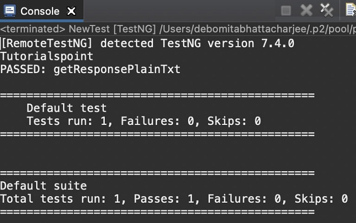 使用 Rest Assured,我們將獲取文字格式的響應正文 Tutorialspoint。