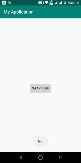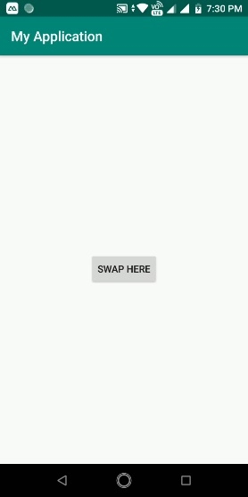 <?xml version = "1.0" encoding = "utf-8"?> <LinearLayout xmlns:android = "http://schemas.android.com/apk/res/android" xmlns:app = "http://schemas.android.com/apk/res-auto" xmlns:tools = "http://schemas.android.com/tools" android:layout_width = "match_parent" android:gravity = "center" android:layout_height = "match_parent" tools:context = ".MainActivity" android:orientation = "vertical"> <Button android:id = "@+id/swap" android:layout_width = "wrap_content" android:layout_height = "wrap_content" android:layout_alignParentTop = "true" android:layout_centerHorizontal = "true" android:layout_marginTop = "27dp" android:text = "Swap here"/> </LinearLayout>