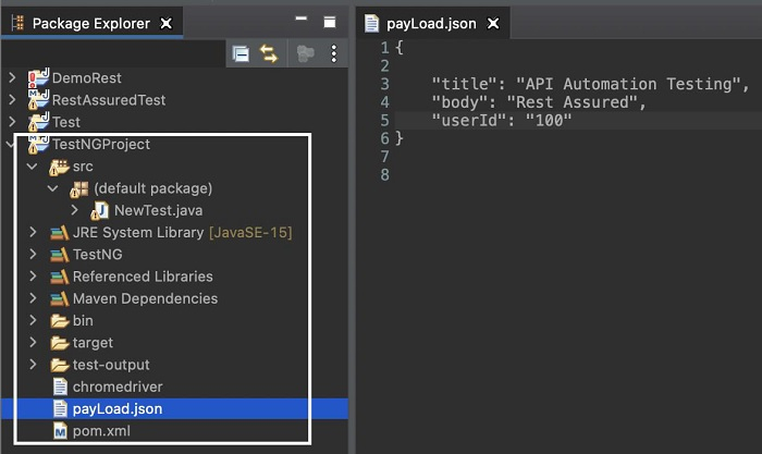 讓我們建立一個 JSON 檔案,叫作 payLoad.json,並在下方 JSON 格式中新增一個請求主體。這是在專案內建立的。
