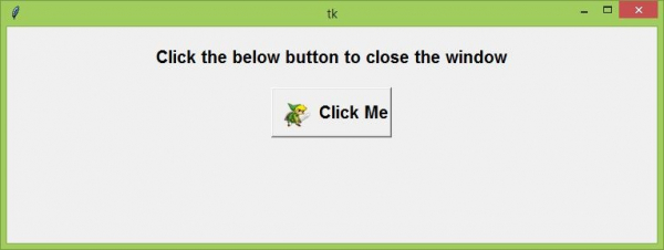 #Import tkinter library from tkinter import * from PIL import Image,ImageTk #Create an instance of Tkinter frame or window win= Tk() #Set the geometry of tkinter frame win.geometry("750x250") #Define a function to close the window def close_win(): win.destroy() #Load the image image = Image.open('preview.png') #Resize the Image image = image.resize((50,50), Image.ANTIALIAS) #Convert the image to PhotoImage img= ImageTk.PhotoImage(image) #Create a Label Label(win, text="Click the below button to close the window",font=('Aerial 15 bold')).pack(pady=20) #Create a label with the image button= Button(win, text="Click Me",font= ('Helvetica 15 bold'),image=img, compound= LEFT, command=close_win) button.pack() win.mainloop()