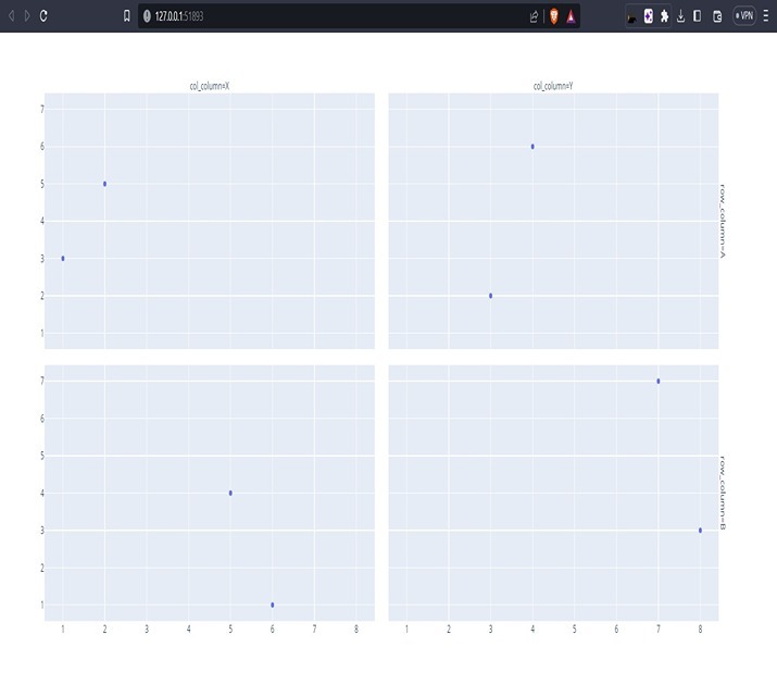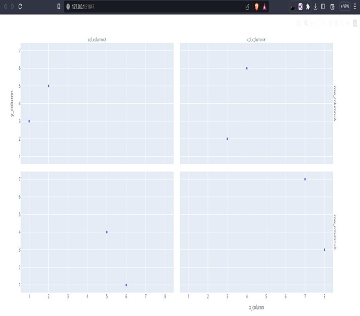 然後,我們使用 px.scatter 函式建立圖形。我們指定散點圖的 x 和 y 列,並使用 facet_row 和 facet_col 引數根據指定的列建立 facets。這將生成一個散點圖,其中包含每個 facet 值組合的單獨子圖。