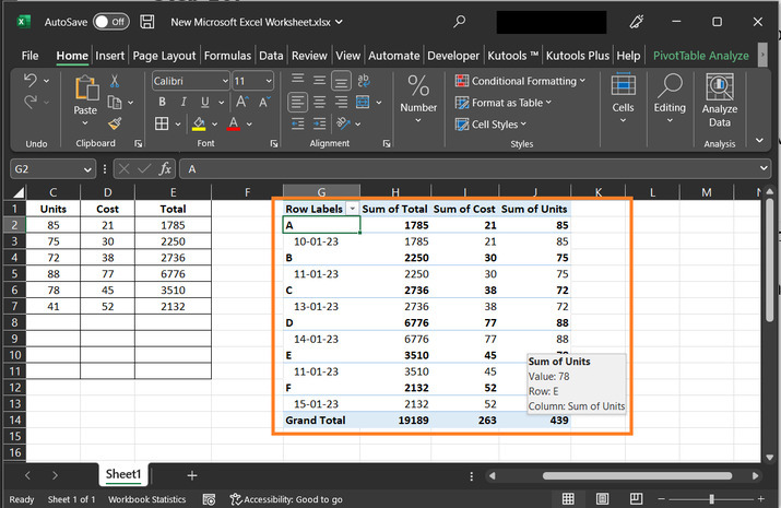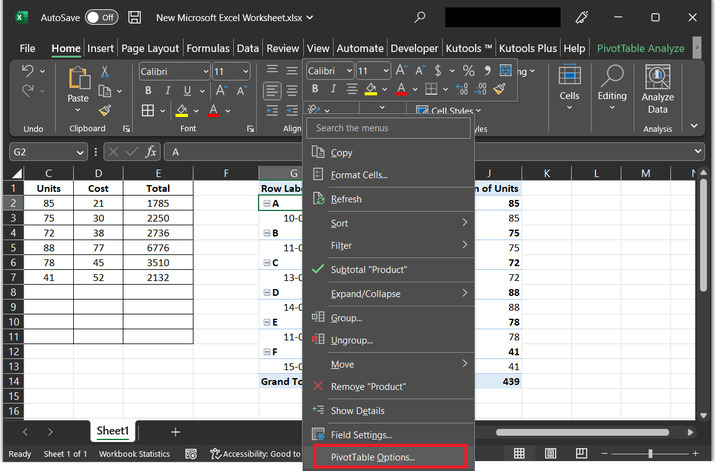 從行標籤中選擇 A,然後右鍵單擊資料透視表單元格。這將顯示一個下拉選單。在提供的選項列表中,選擇“**資料透視表選項**”選項。