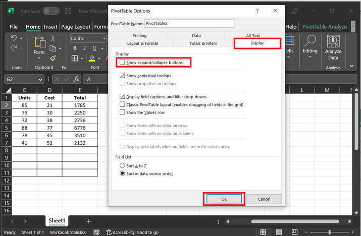 上述步驟將顯示一個“**資料透視表選項**”對話方塊,如下所示。在出現的對話方塊中,單擊“**顯示**”選項卡。然後取消選中“**顯示展開/摺疊按鈕**”複選框(位於顯示部分下),最後單擊“**確定**”按鈕。