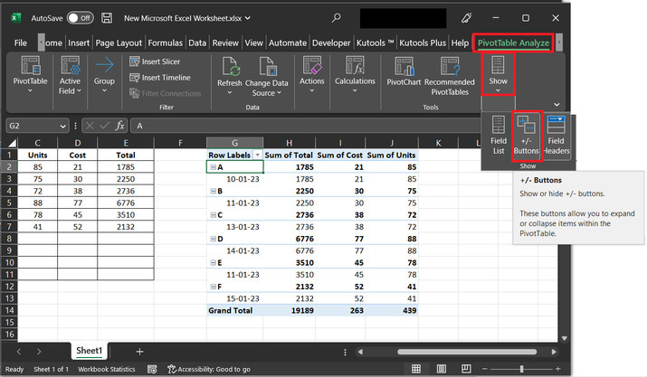 單擊下圖中突出顯示的“**分析**”選項卡中“**顯示**”組下的“+/-**按鈕**”命令以隱藏展開/摺疊按鈕。
