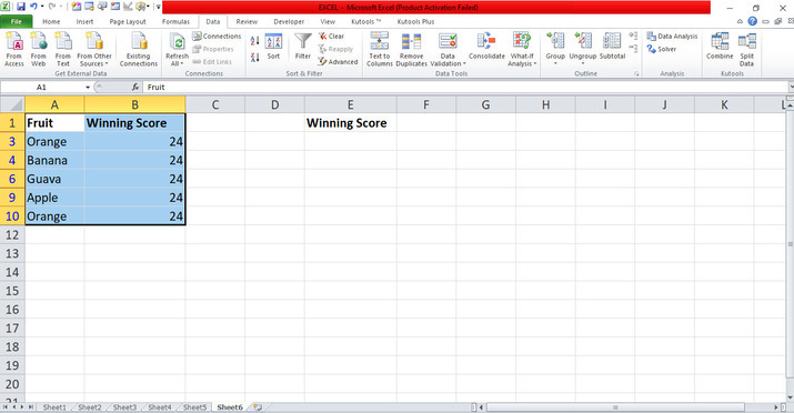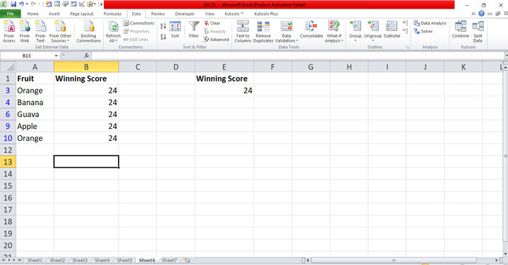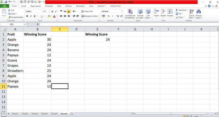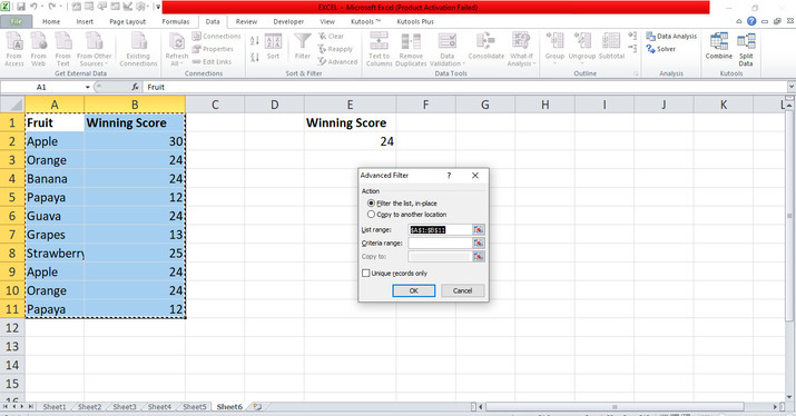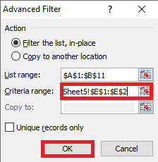 在對話方塊中,將游標放在“條件區域”中,並在工作表中選擇從 E1 到 E2 的 E 行,以篩選僅為 24 的值。單擊“確定”按鈕,這將自動篩選工作表中包含數字 24 的資料,如下所示。
