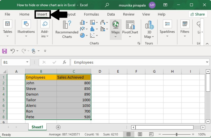 選擇完整的銷售資料,然後單擊“插入”選項卡,如下所示。