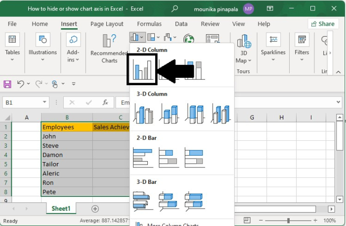 在圖表中選擇 2-D 柱形圖。您將看到包含銷售額的圖表,如下所示。