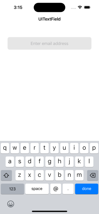 import UIKit class TestController: UIViewController { private let emailTextField = UITextField() override func viewDidLoad() { super.viewDidLoad() initialSetup() } private func initialSetup() { // basic setup view.backgroundColor = .white navigationItem.title = "UITextField" // emailTextField customization emailTextField.keyboardType = .emailAddress emailTextField.layer.cornerRadius = 8 emailTextField.backgroundColor = UIColor(white: 0, alpha: 0.1) emailTextField.placeholder = "Enter email address" emailTextField.textAlignment = .center emailTextField.autocorrectionType = .no emailTextField.autocapitalizationType = .none emailTextField.returnKeyType = .done // adding the constraints to emailTextField view.addSubview(emailTextField) emailTextField.translatesAutoresizingMaskIntoConstraints = false emailTextField.heightAnchor.constraint(equalToConstant: 50).isActive = true emailTextField.leadingAnchor.constraint(equalTo: view.leadingAnchor, constant: 30).isActive = true emailTextField.trailingAnchor.constraint(equalTo: view.trailingAnchor, constant: -30).isActive = true emailTextField.topAnchor.constraint(equalTo: view.safeAreaLayoutGuide.topAnchor, constant: 50).isActive = true } }