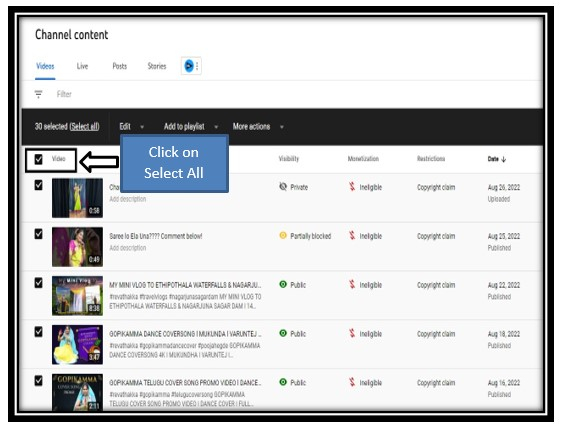 步驟 3 - 如果您想隱藏頻道上所有影片的點贊和點踩按鈕,您可以選中所有影片的複選框。