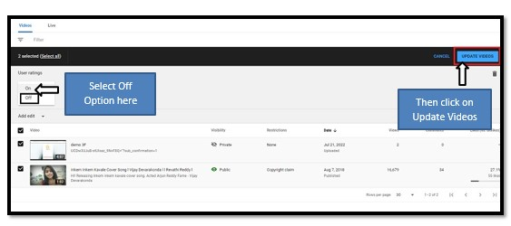 步驟 6 - 在使用者評分中,從新值框中選擇“關閉”按鈕,然後點選“更新影片”(如下圖所示),但這需要一些時間來更新影片。