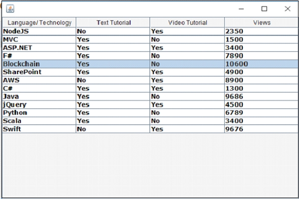 tableModel.addRow(new Object[] { "SharePoint", "Yes", "Yes", "4900"});透過新增行的間隔來高亮顯示單個行。由於我們只需要高亮顯示一行,因此為兩個引數設定相同的索引 -