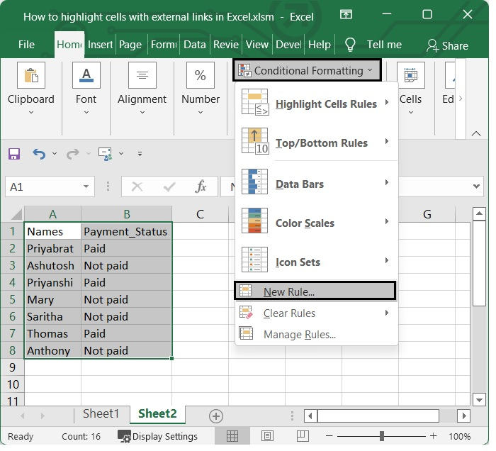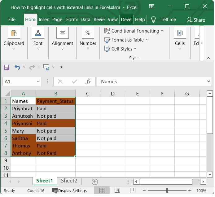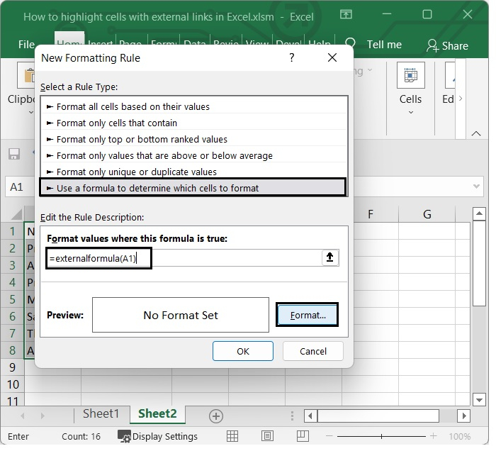 如果您想突出顯示包含外部連結的 Excel 單元格,您需要先建立一個使用者定義函式,然後使用條件格式功能。Excel 沒有提供直接執行此操作的方法。在本教程中,我們將學習如何使用 VBA 突出顯示包含外部連結的單元格。