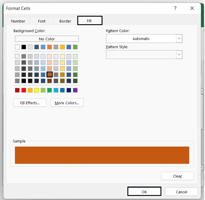 然後,單擊**格式**按鈕轉到**設定單元格格式**對話方塊。在**填充**選項卡下,根據您的需要選擇一種顏色。請參見下圖。