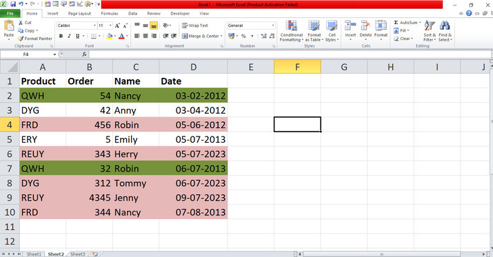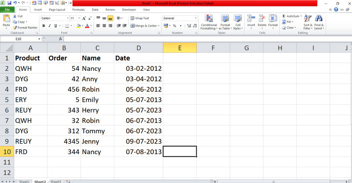 準備包含資料的 Excel 表格。首先,開啟 Excel 表格並逐個建立資料。在此表格中,隨機輸入產品及其訂單名稱和日期,它將建立使用者需要突出顯示的資料,如下所示。