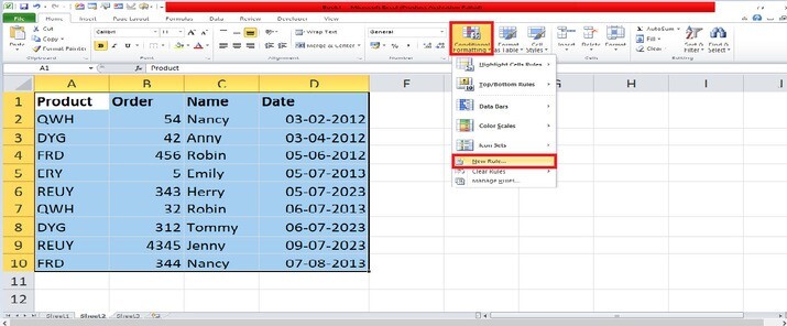 在 Excel 表格中,顯示建立的資料。在列表中根據多個值建立行後,將游標放在單元格 A2 中,然後選擇使用者逐個插入資料的全部單元格。在選擇表格中的所有資料後,將游標放在功能區中。在“開始”選項卡上,放置游標並單擊“條件格式”的下拉選單。在此選項卡上,包含許多選項。單擊“新建規則”按鈕,將開啟“新建格式規則”對話方塊,如下所示。
