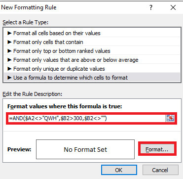 在對話方塊中,有一個輸入型別,並將游標放在上面。現在,輸入公式=AND($A2=”QWH”, $B2>50) 以突出顯示相同的產品,並且訂單欄位中的值必須大於 50,如下所示。