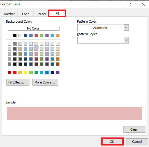 在對話方塊中,放置游標並單擊“格式”按鈕,這將開啟一個新的對話方塊“設定單元格格式”,其中包含“填充”選項卡。在“設定單元格格式”對話方塊中,包含了選項卡。現在,單擊“填充”選項卡,它將顯示如下所示的顏色主題。