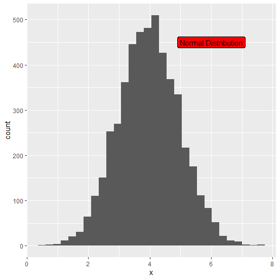 library(ggplot2) ggplot(df,aes(x))+geom_histogram(bins=30)+geom_label(aes(x=6,y=450,label="Normal Distribution"),fill="red")